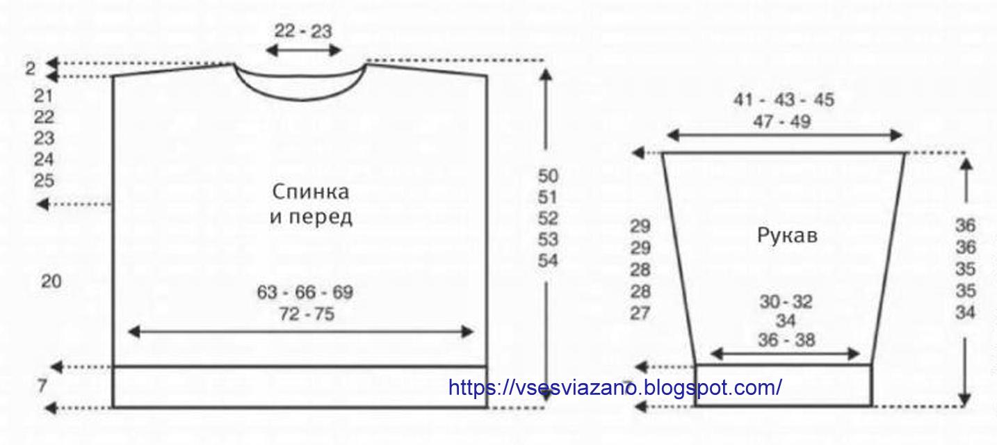 РУКАВА: на спицы № 7 набери 30 (30) 34 (34) 38 п. и свяжи для планки 7 см резинкой, начинай заканчивай 1-й р. 1 лицевая. Далее продолжай ажурным узором, равномерно распределяя в 1-м р. 2 прибавки для размеров 38/40 (46/48) = 30 (32) 34 (36) 38 п. Прибавь с обеих сторон в каждом следующем 6-м р.